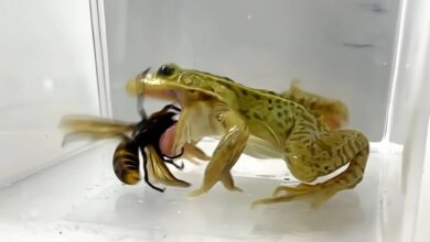 زنبورهای قاتل کابوس جانوران دیگر هستند؛ اما قورباغههای بیباک برکه آنها را یک لقمه میکنند